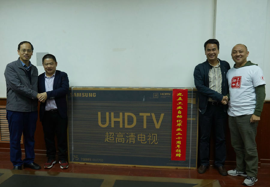 会议伊始,员工们逐一自我介绍。接着,与会师生一同观看了20年前的毕业录像剪辑,回忆了难忘的点点滴滴。而后,叶浩、李赟两位员工代表全班同学向学院捐赠了75吋超高清电视机,以感谢母院的培养。