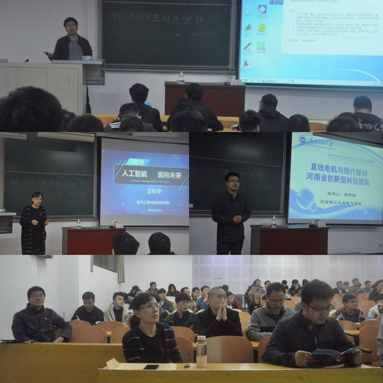 宣讲会开始前,高庆华老师通过近几年全国硕士研究生报考人数变化趋势给大家分析了2021年的考研形势,并对学院各学科研究方向、2021年招生目录、学院培养环境和相关激励政策进行了讲解。接着本次特邀的“人工智能”、“有机太阳能电池与传感器件”、“新型电机与智能控制”、“新能源发电与智能微电网”、“智能测量与信息处理”等团队人员分别从团队整体情况、研究内容与特色、代表性研究成果、团队激励措施等方面向同学们进行了宣讲。